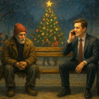É noite de natal, a rua começa a ficar deserta, o Mendigo está lá.Um Homem Rico teve “pane seca” no