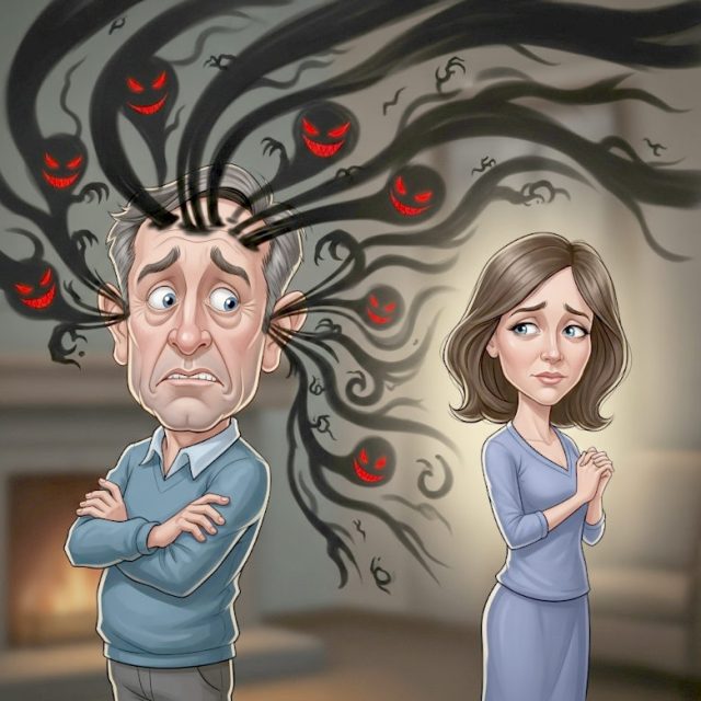 SOMBRA: Mas você que me deixou entrar na sua vida! Ahh deixou… Você mesmo que abriu a porta, bobinho! Mas não se sinta culpado… (risos), sua esposa não foi boa pra você! (massageando a cabeça dele)…